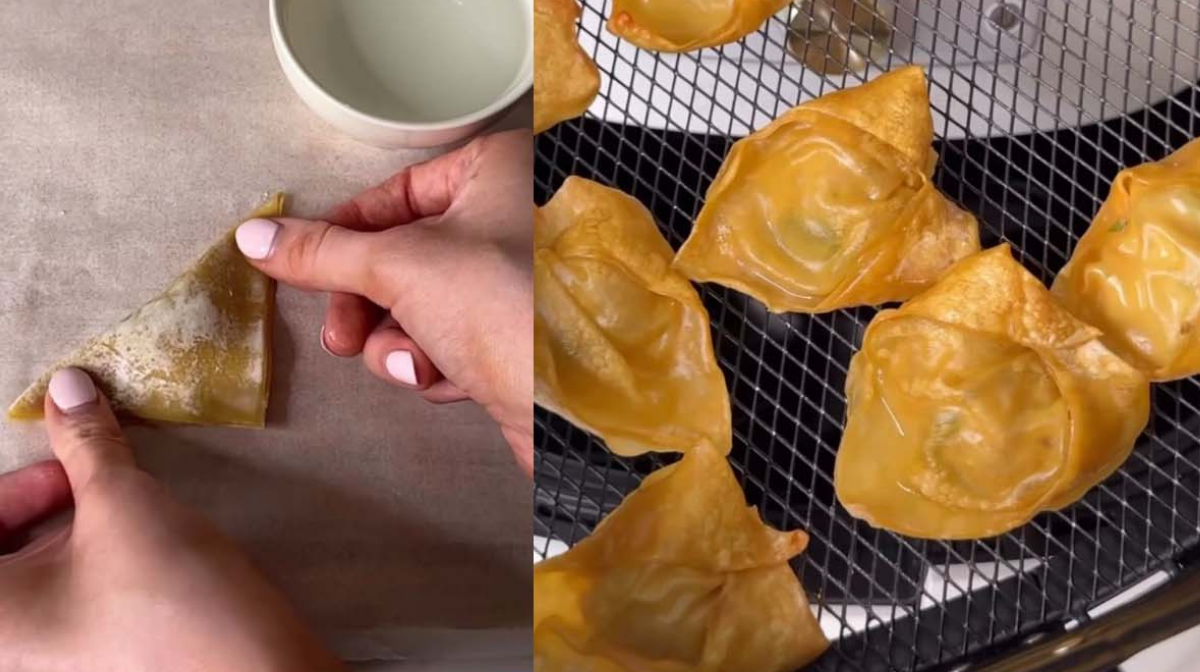 Dip a finger in the water and wet the edges of the wrapper to help them stick together, before folding diagonally to create a triangle shape with the meat filling covered in the centre.