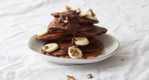 2. Once the pancakes are cooked, stack them up with banana slices and pecans between them and pour your heavenly chocolate sauce over the lot.