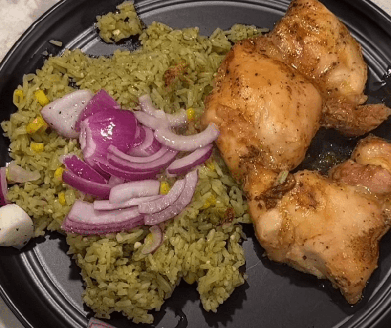 • cilantro blended with 1/4 cup water • onion, garlic, and Aji Amarillo • 3/4 cup dark beer • rice and two cups water • salt • pepper • corn