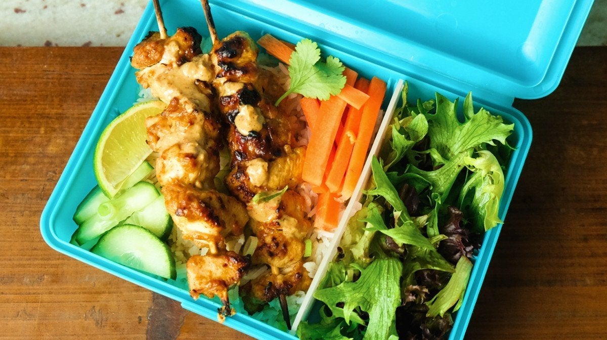 - Put together 4 meal prep boxes by adding 2 skewers into each container on top of a bed of rice and salad, then garnish with coriander and a lime wedge. This will last 3-4 days refrigerated.