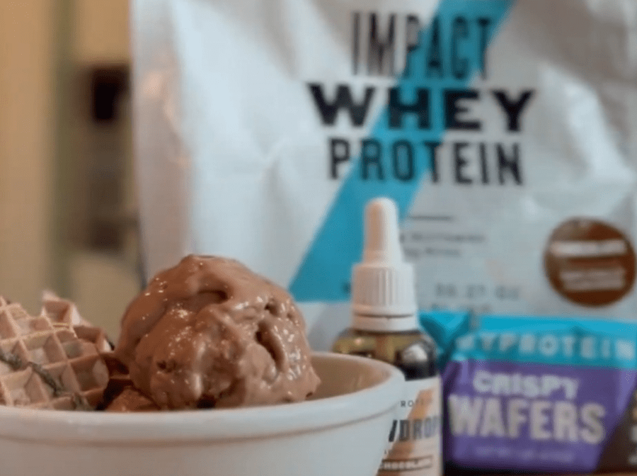 Pour mixture back into your container of choice and mix through any extra preferred add-ins along with 1/2 a Myprotein chocolate wafer chopped. Save the other half of the wafer for a crunchy ice cream topping.