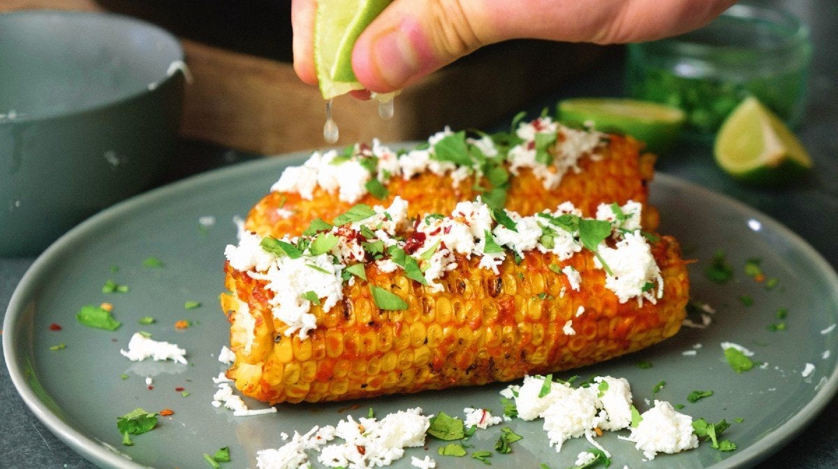 - Sprinkle grated feta onto the grilled corn, garnish with chilli flakes and coriander, then finish with a generous squeeze of lime and enjoy.