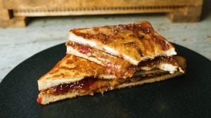 - Whilst the French toast is still warm, spread your peanut butter and jam onto one slice, then cover with a top slice to make a sandwich.