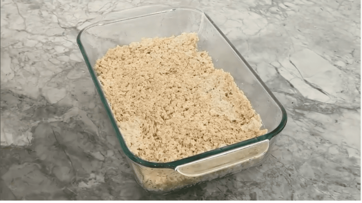 5. Add your mixture to a greased baking dish and press it into the corners so it’s evenly distributed.