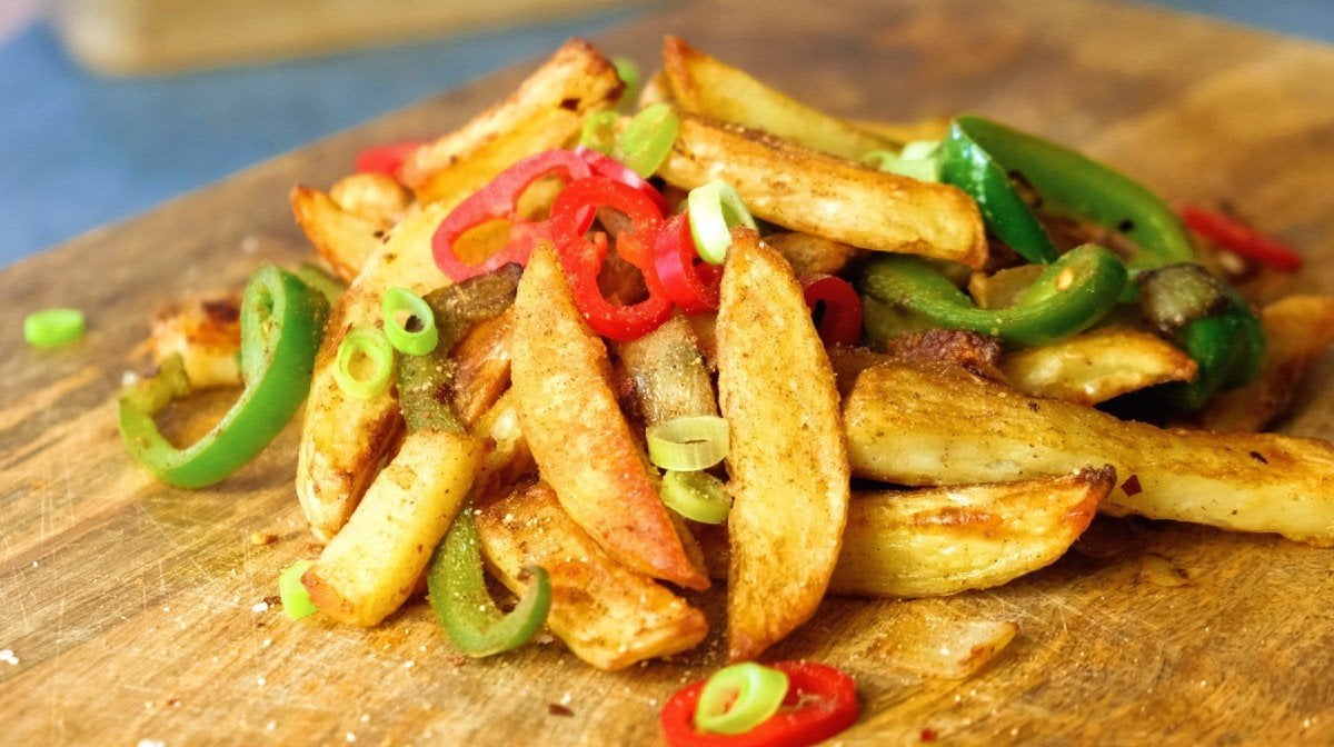 - Mix together until all chips have a light coating of aromatic spice blend. Then garnish with chopped spring onions and chillies. Heaven.