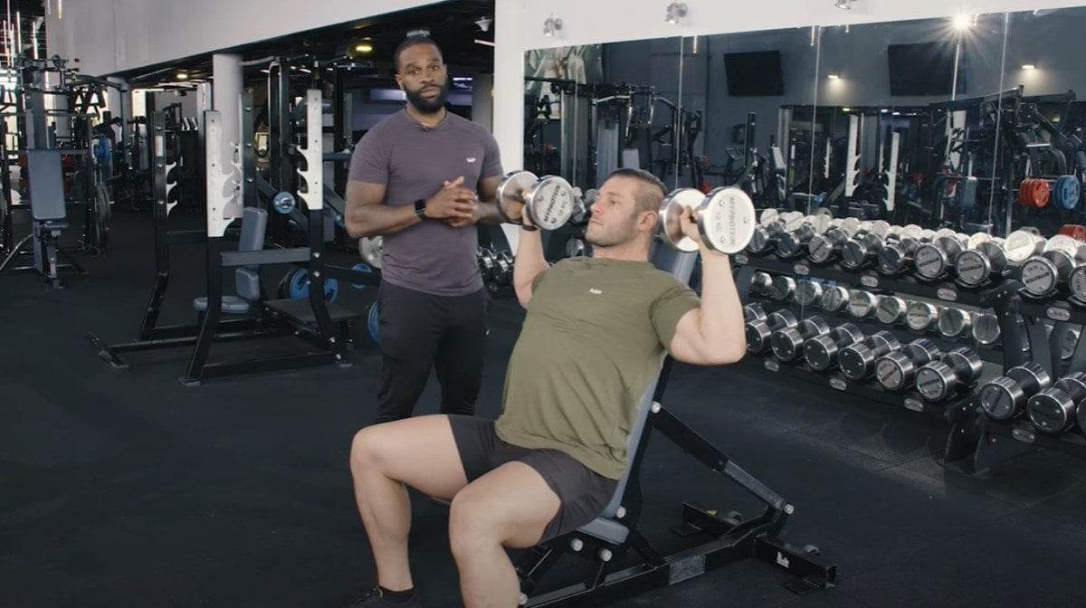 - Lower the dumbbells to around chin level and then press them back up.