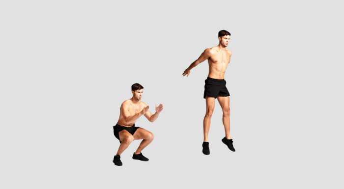 - Push back up through your heels and as you do, jump up, using your arms to propel you upwards.